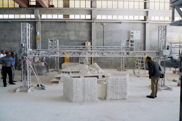 The picture below shows a block that weighs 1.5 tonnes and was produced using the D-Shape 3D printer as an example. The material was 99.8% identical to regolith and was taken from basalt rocks of one of the Central Italy volcanoes.