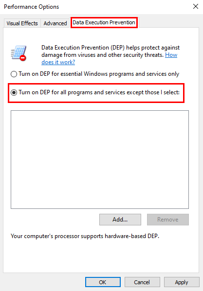 - On the upper tab, click on Data Execution Prevention and choose Turn on DEP for all programs and services except those I select: