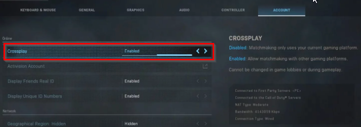 Disable Crossplay: Launch Modern Warfare, click on “Options,” and select the “Account” tab. Find the “Crossplay” on the list, and set it to “Disabled.”