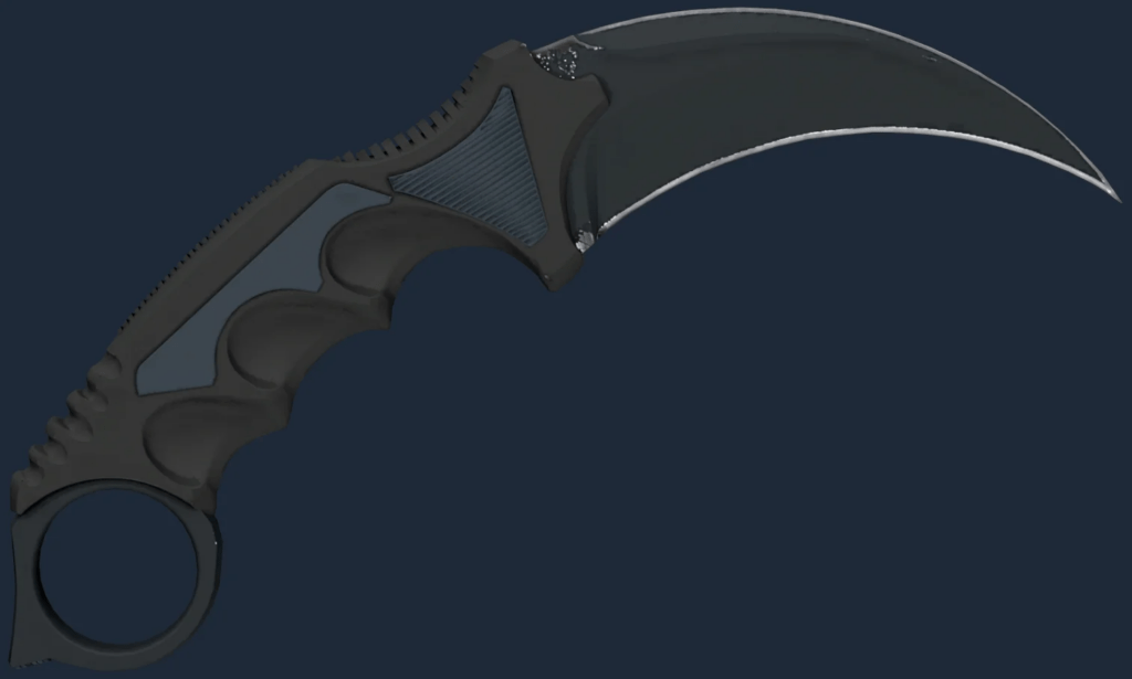 Another variant of the CS:GO Karambit knife. It has all the classic features. The short, curved, claw-shaped blade is sharpened on the inside. The handle has three deep grooves for the fingers and an end ring holder for the little finger. The dark blade is covered with a neat black pattern.