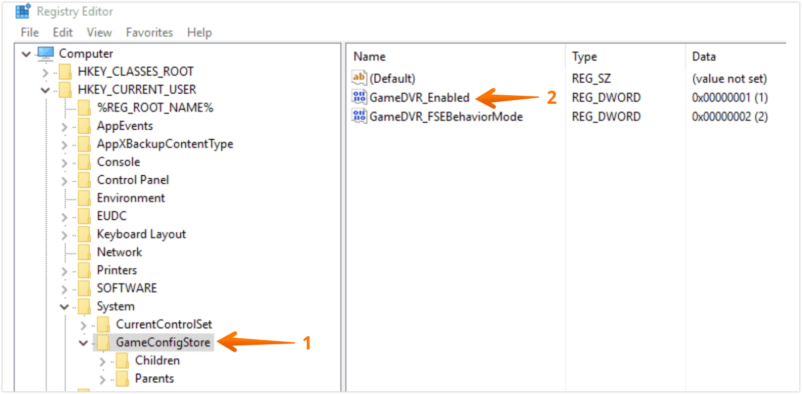 - On the left pane, go to GameConfigStore after that. On the right-hand side, right-click on the GameDVR_Enabled